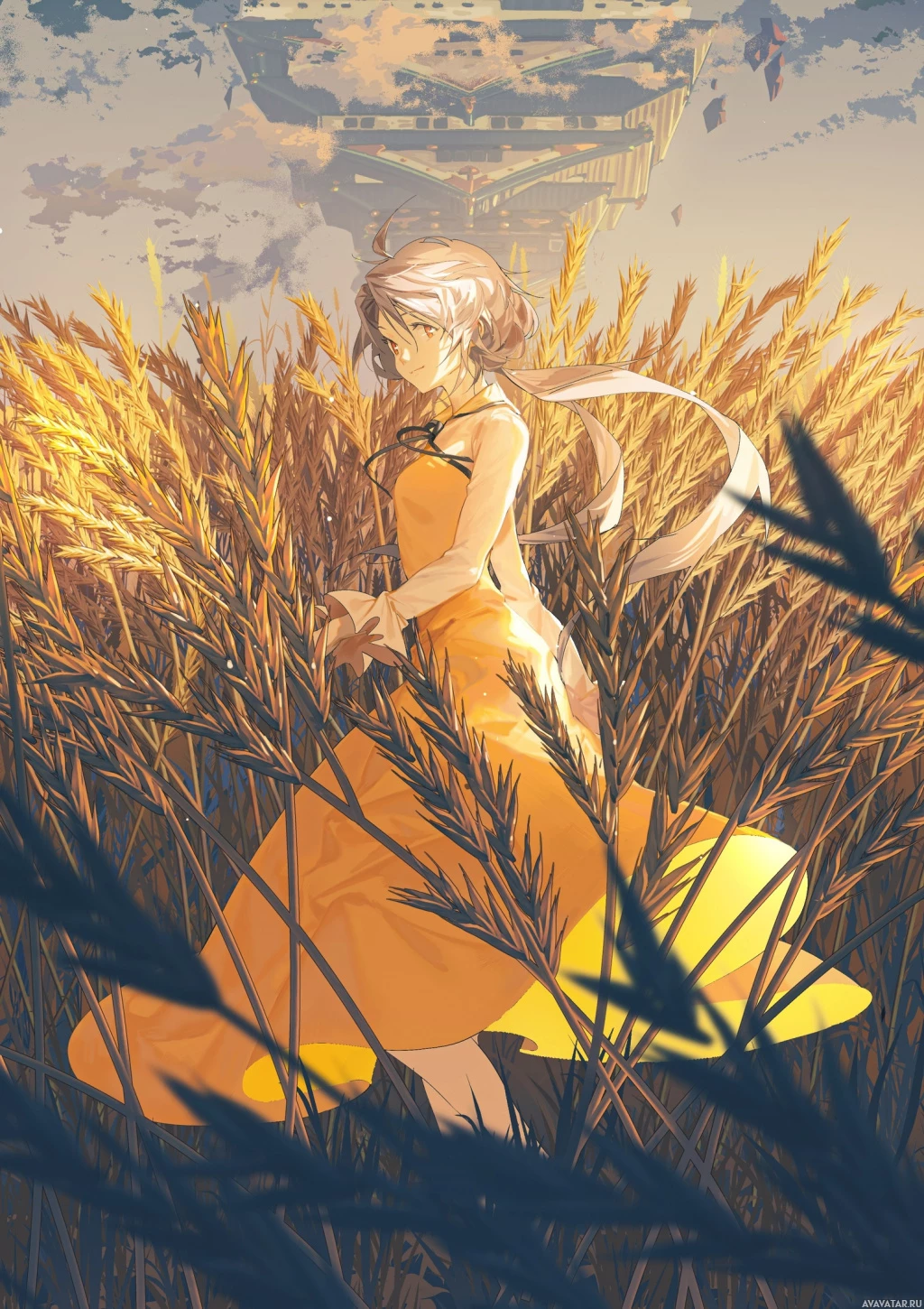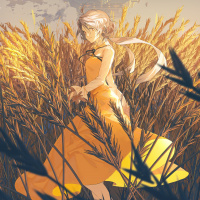 a yellow dress and appears to be standing in a field of tall grass or crops. The
