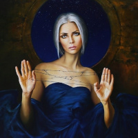 a serene expression and her hands are raised, as if she is holding something or offering a blessing. She is dressed in what appears to be a flowing robe of a deep