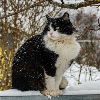 shorthair cat with a coat that is mostly dark, possibly black or gray, with some lighter patches on its face and chest. The cat's eyes are wide open and it seems curious about its surroundings. There is light snow falling around the cat, indicating cold