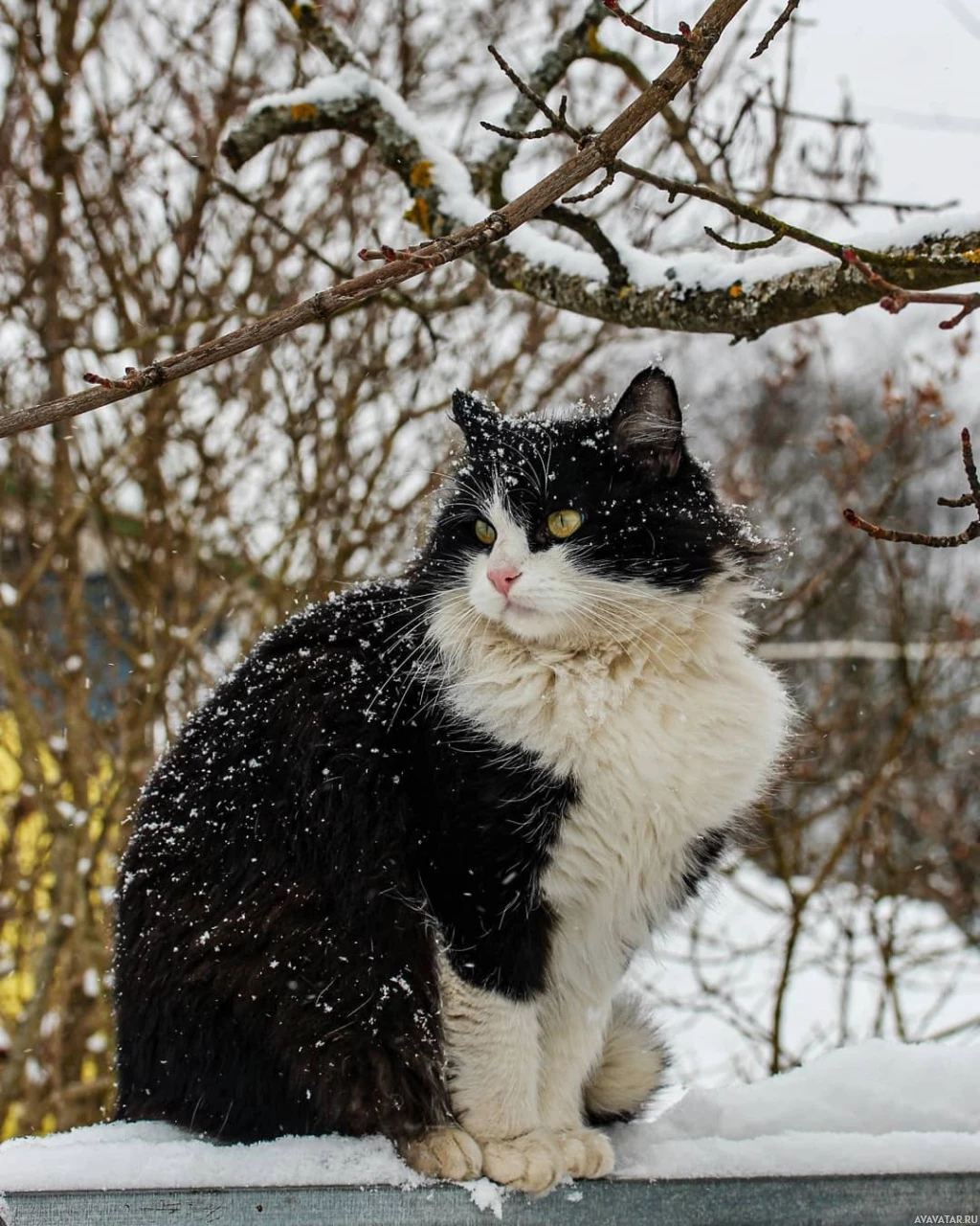 The image shows a cat sitting in the snow. It appears to be a domestic