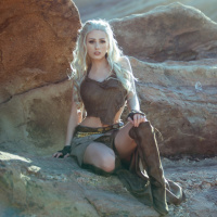 armor pieces and clothing that are associated with Daenerys' character, including a flowing dress that could be inspired by her attire from the series. The person is portraying the character with a pose and expression that evokes confidence and strength, which are traits often associated with Daenerys Targaryen.