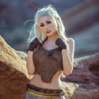 blonde hair, which is styled in a way that complements their outfit, and they are posing on a rocky terrain, possibly to mimic the rugged landscapes of Westeros from the series. The costume seems well-crafted and is designed to evoke the character's unique style.