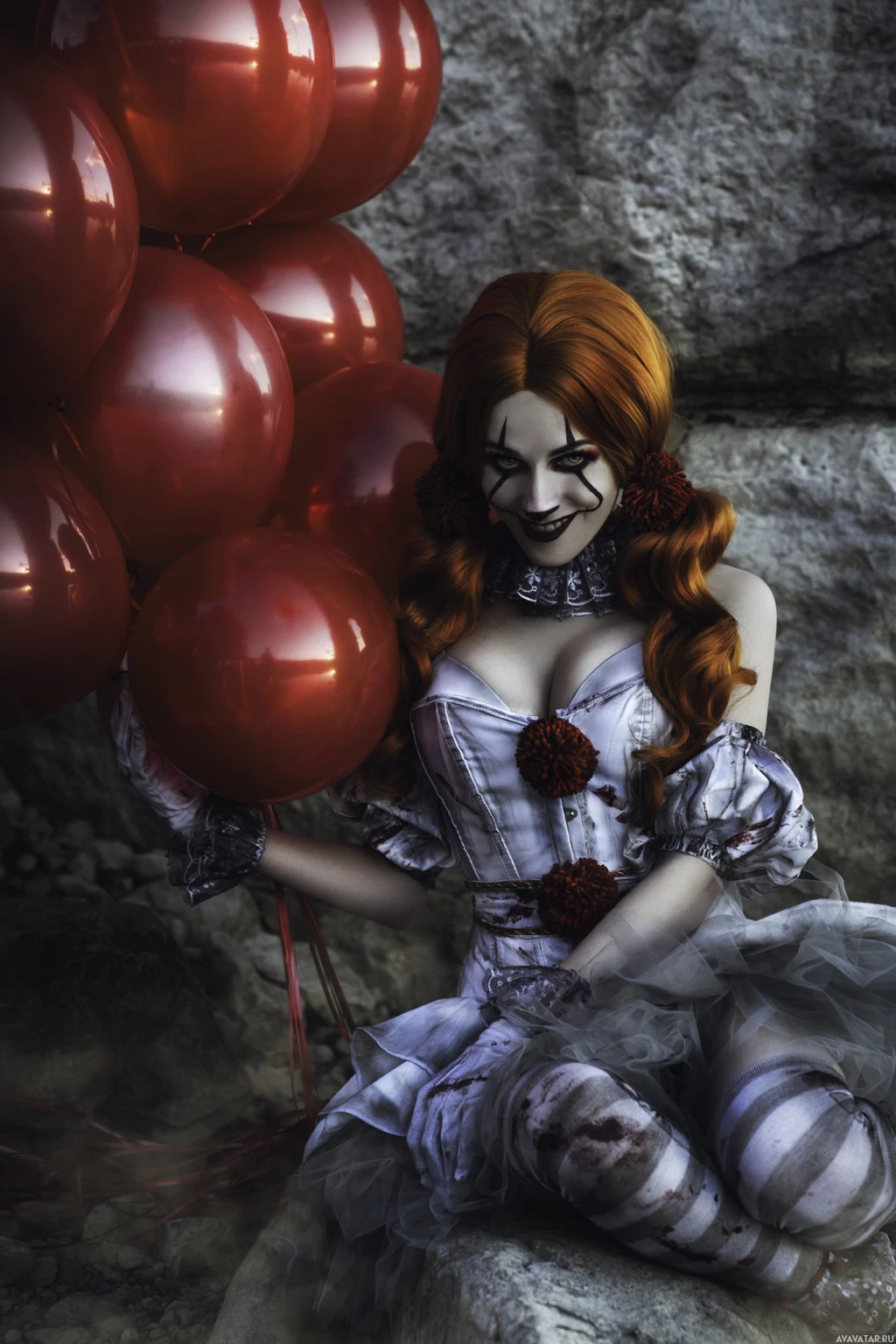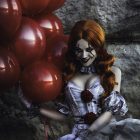 red balloons. The setting appears to be outdoors and somewhat dramatic, with a dark background that could imply