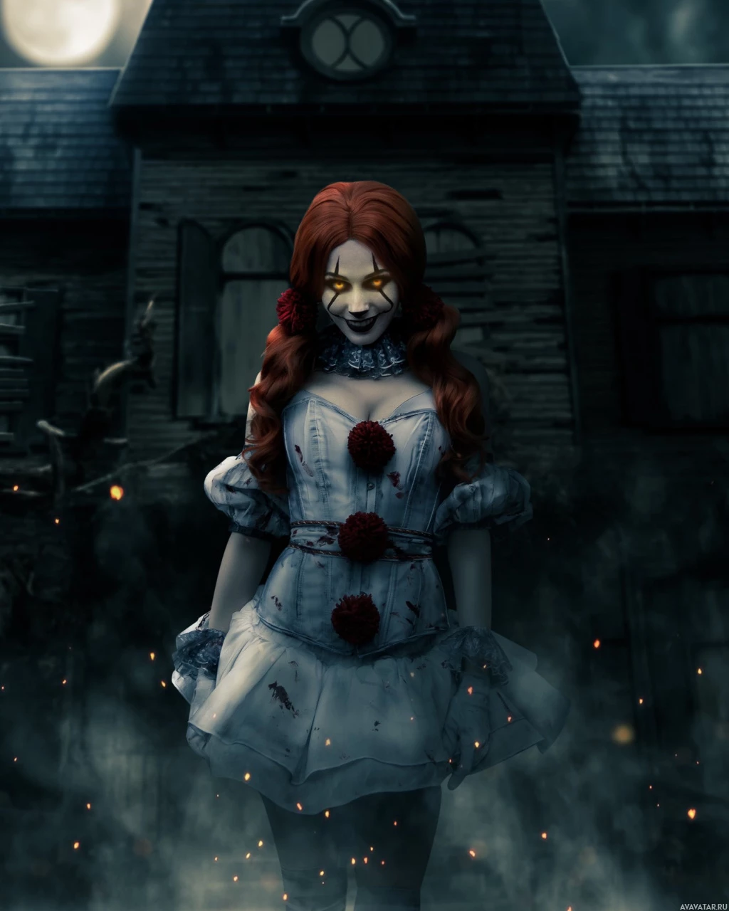the main antagonist from Stephen King's horror novel "It." This character is depicted as a clown-like creature who preys upon children and occasionally returns in adulthood. The girl in the picture is dressed in a costume resembling that of Pennywise, complete with a red nose, white face paint, and