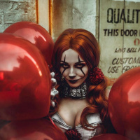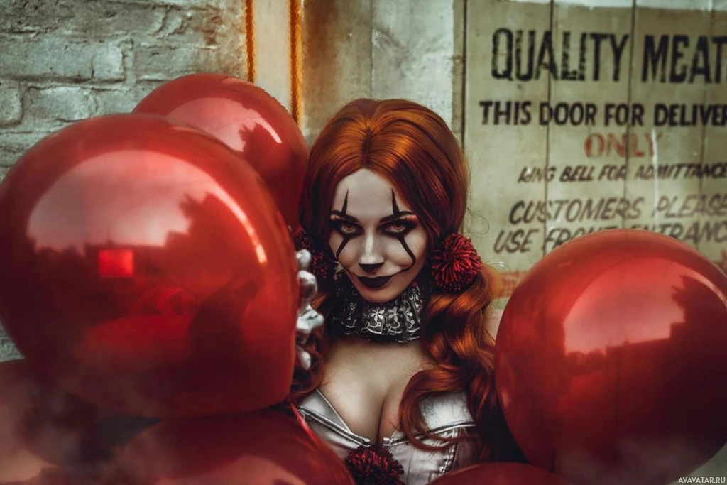 red balloons. The individual is dressed in a style that suggests they might be portraying a character from