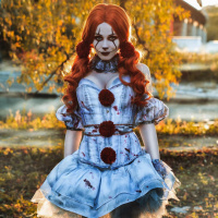 blood splatters, adding to the eerie and creepy effect of the cosplay. The setting appears to be a park or an outdoor area with