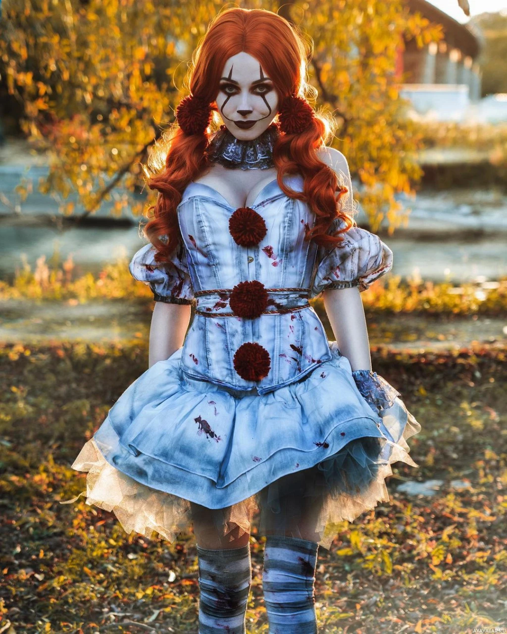 red hair and makeup to emulate the clown's appearance. The outfit is adorned with what appear to be