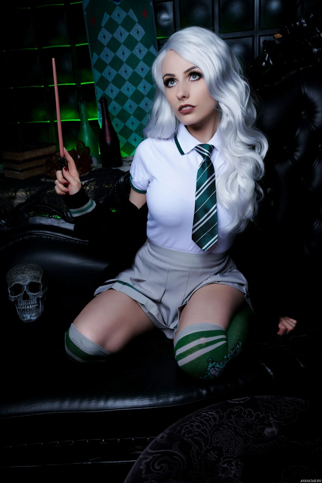 a Hogwarts uniform, including a blazer, shirt, and skirt, with socks in the same house color. In their hand, they are holding what appears to be a wand, which is associated with witchcraft and magic in