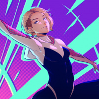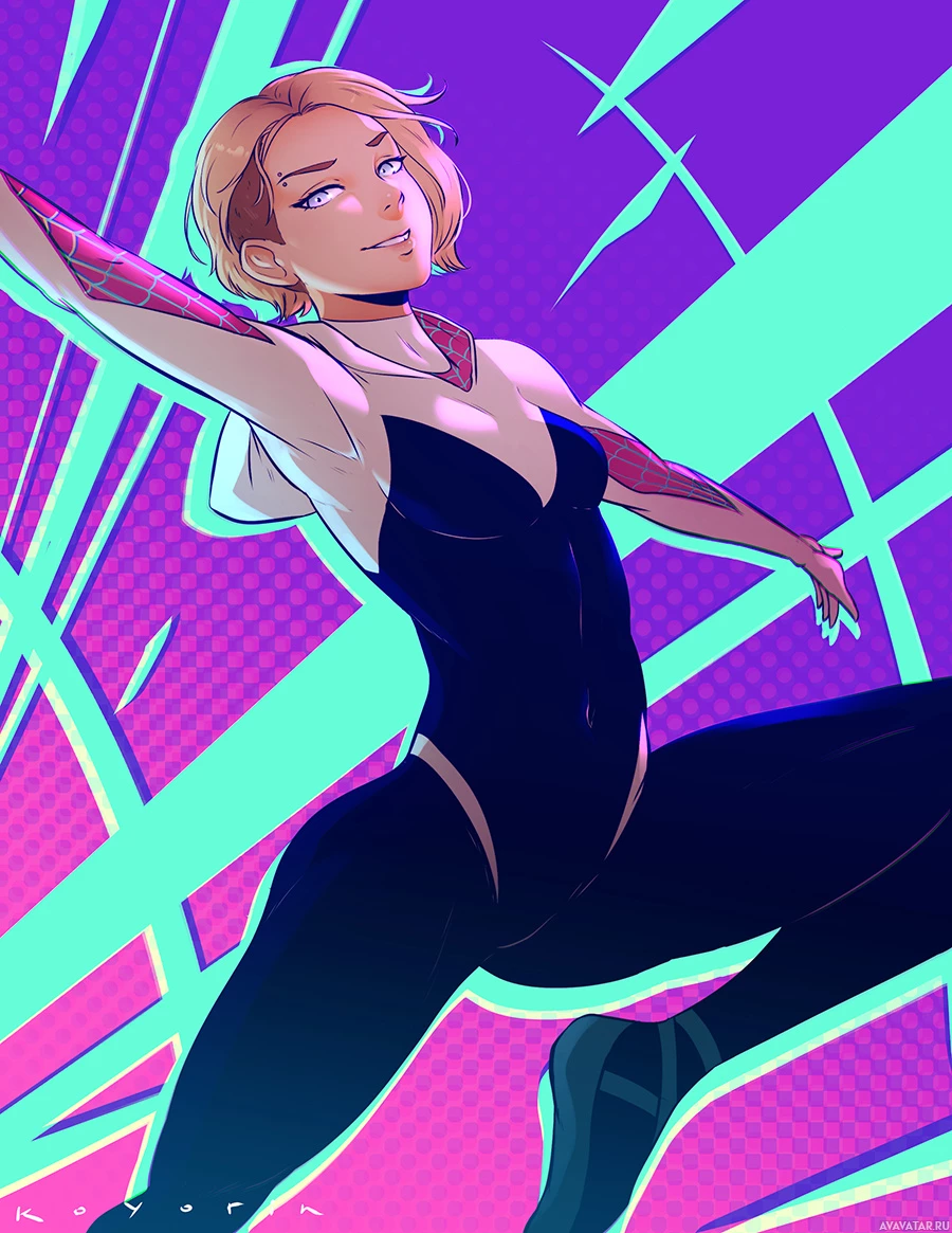 a black bodysuit with white accents, which could indicate that she is portrayed as Spider-Woman. The background is vibrant and abstract, with