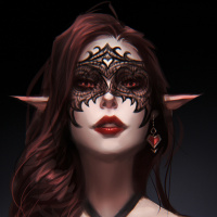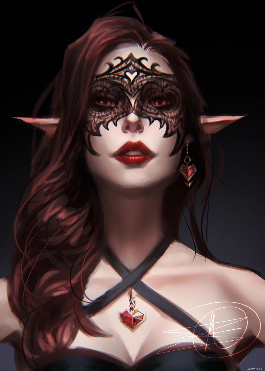 a black top and what appears to be a red accent, possibly a necklace or jewelry. The overall aesthetic suggests a fantasy theme.