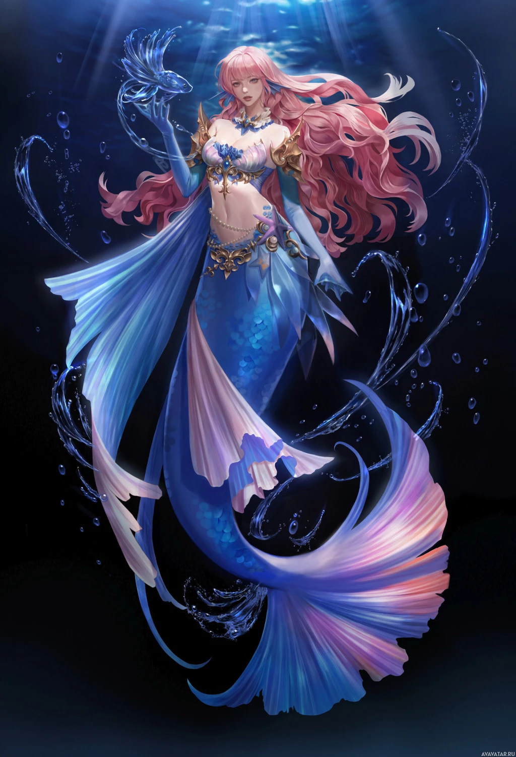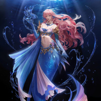 body of a human, but with a fish-like tail. She's wearing armor and holding what appears to be a trident, which is a common symbol for merfolk in
