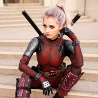 comic books and movies. They are wearing a red and black costume with the iconic Deadpool logo, which is