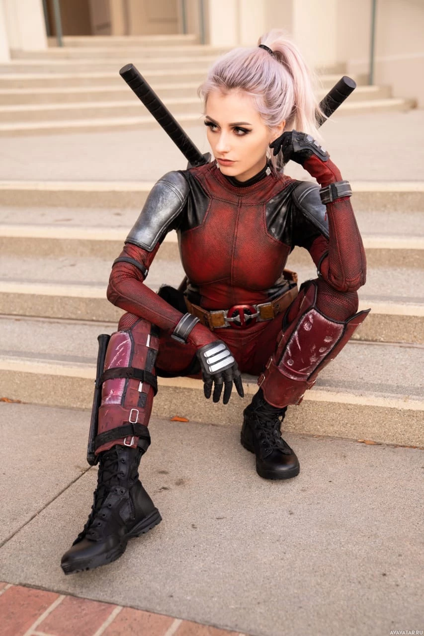The image shows a person dressed as the character Deadpool from