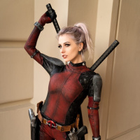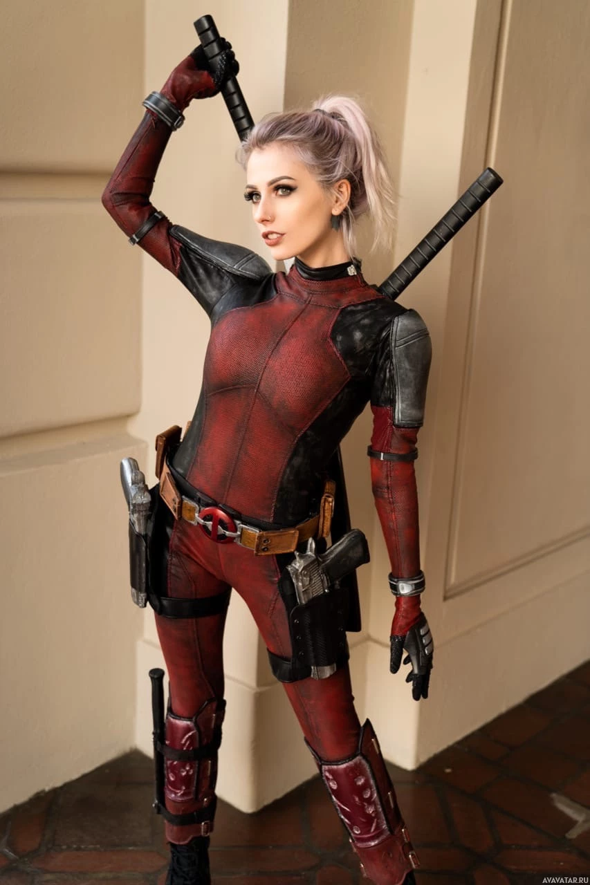 The picture features a person dressed in the costume of Deadpool, a popular character from