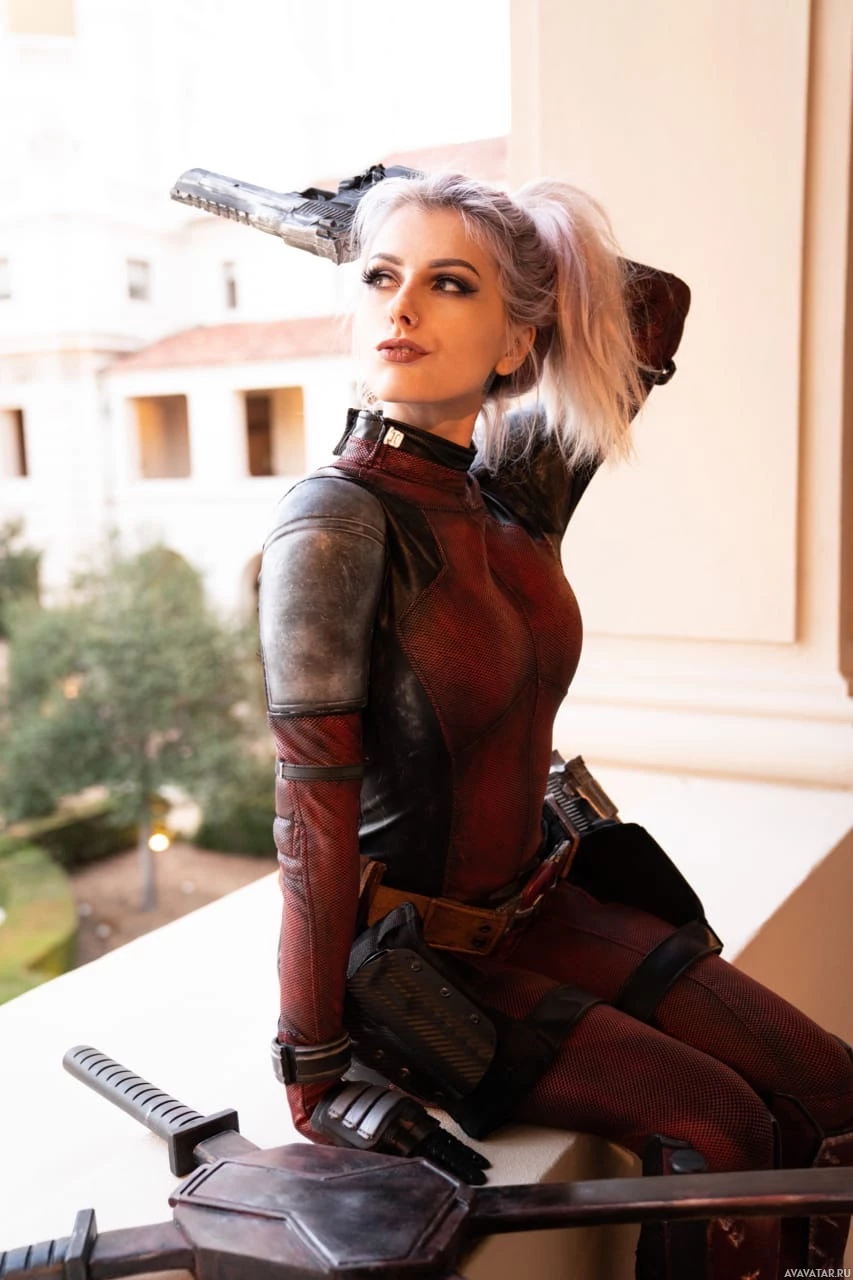 a cosplay outfit that resembles the character Deadpool from Marvel Comics. They are wearing a red and black costume with