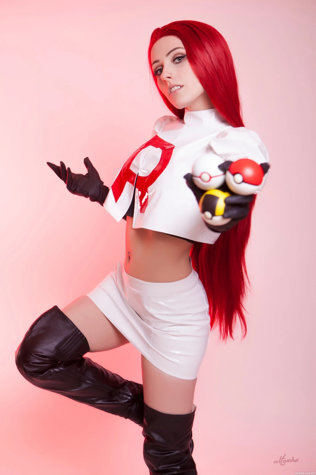 an electronic device or gadget in the other, which adds to the character's accessories typically associated with Jessie from Team Rocket.