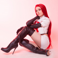 red hair, outfit, and boots. The individual appears to be posing for the photo with a confident or playful expression.