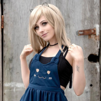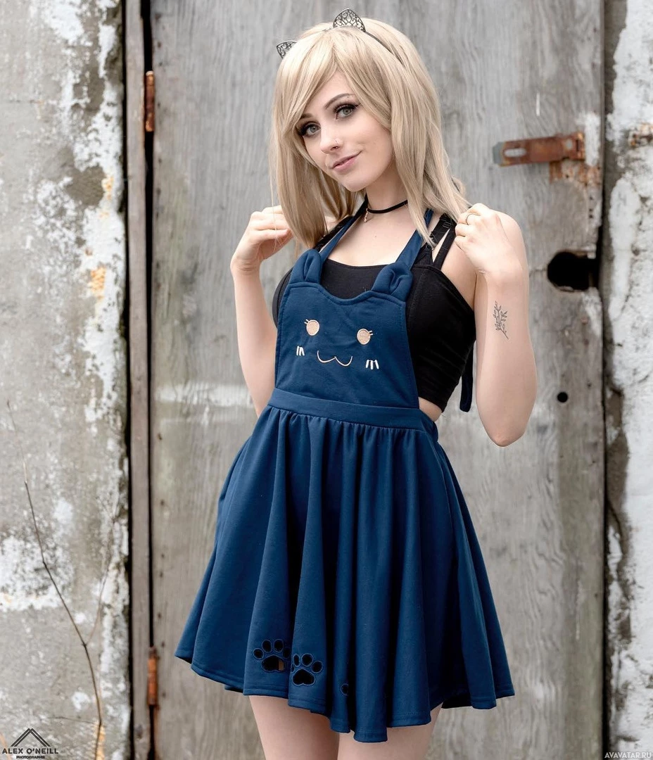 a young woman posing in front of what appears to be a metal structure or door. She is wearing an outfit that includes a denim skirt with a cat