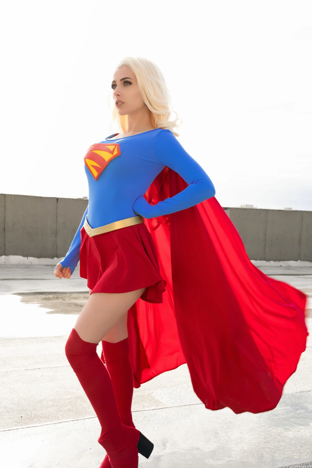 The image features a person dressed in a Supergirl costume, which is typically associated with the character from the DC