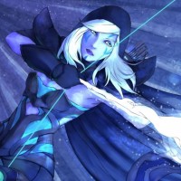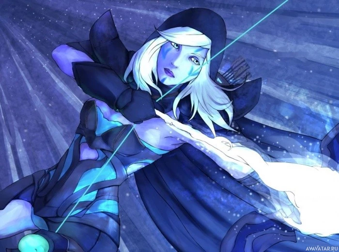 Drow Ranger, and she is recognized by her distinctive blue skin and hair. She is shown in action, wielding a bow and arrow with one hand and a staff with the other, indicating that she might be using