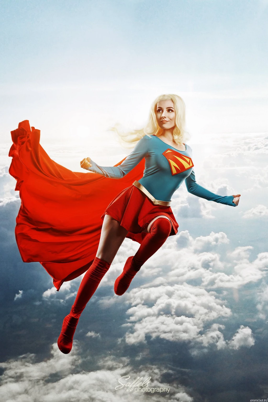 The image depicts a female character dressed in the costume of Supergirl, a well-known superhero from comic books and media. She is shown mid-flight with her arms outstretched, embodying the action-packed nature of the character. The background suggests a dramatic sky scene, possibly implying that she is in flight or responding to a crisis.