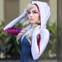 Gwen Stacy from the Spider-Man comics. The individual is wearing a bodysuit with a design that includes red and blue colors, mimicking the iconic Gwen Stacy look. The person also has on a hooded cape, which adds to