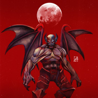 the full moon in the sky above it, adding to the ominous and powerful feel of the character's design. This is not a real photograph but rather digital artwork designed for promotional or