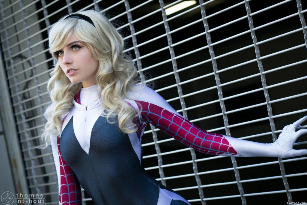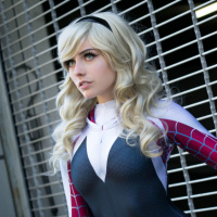 blonde hair styled in waves, and she's posing against a backdrop that appears to be a metal fence or gate, possibly suggesting an urban setting like a park or public space, which could tie into the character of Gwen Stacy being from New York City where Spider-Man is set.