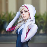 a hooded jacket and a mask that resembles Gwen's superheroine look when she becomes Spider-Woman. The individual is also holding the hood over their head, which is a part of the costume's design.