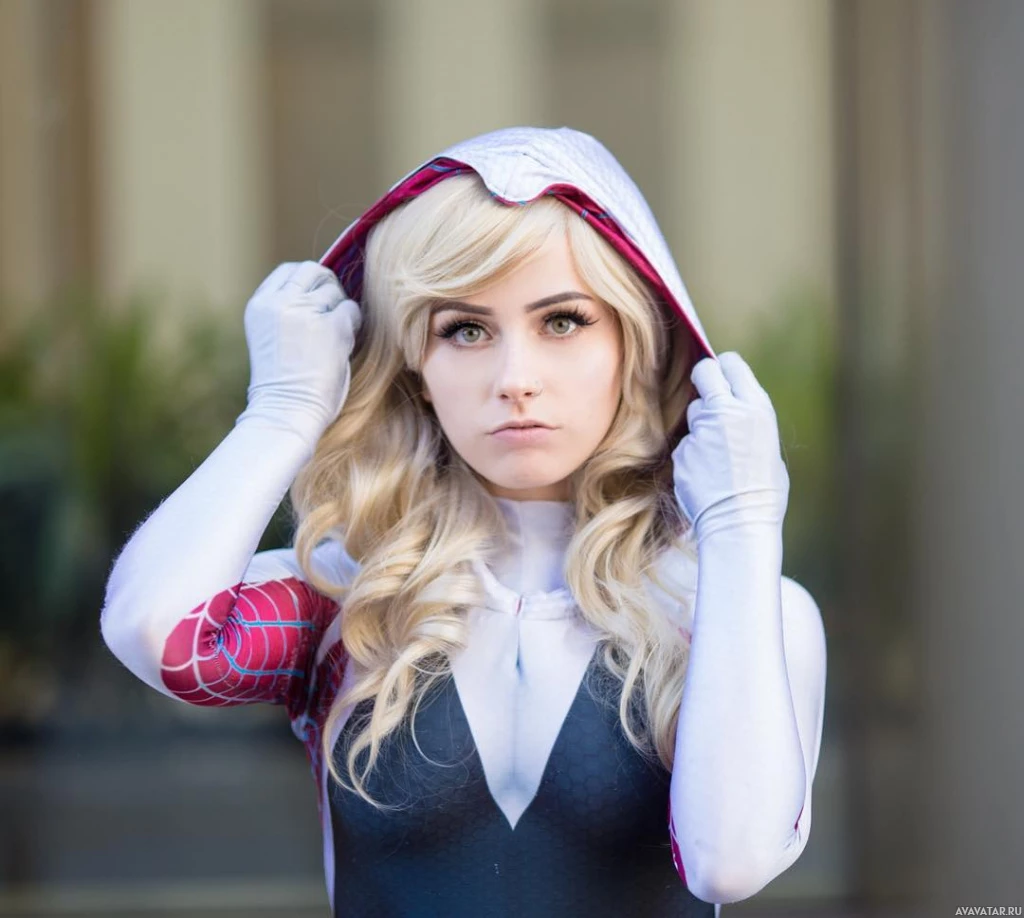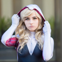 Gwen Stacy, who is also known as Ghost-Spider. The individual appears to be attending an event where cosplay is common practice, such as