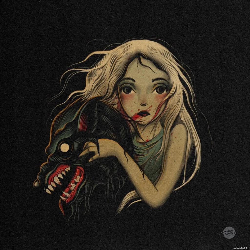red substance around the girl's neck, possibly indicating blood from her injury or damage caused by the creature she's interacting with. The background is dark and provides