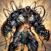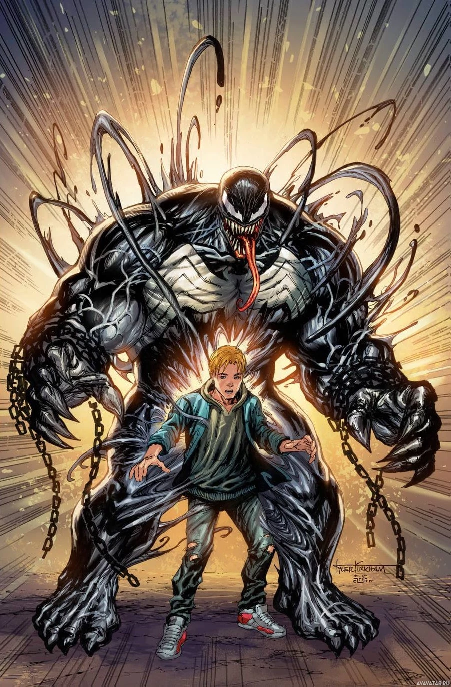 a young boy, and the one on the right is the superhero known as Venom. Venom is a symbiotic creature that typically takes over human hosts by attaching itself to them through their spine, enhancing their physical strength and granting them various powers such as agility,