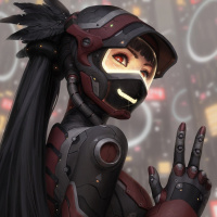 На картинке изображен персонаж, брюнетка в футуристических доспехах и шлеме. На лице у нее веселое выражение, и она делает рукой жест в знак мира. Ее одежда преимущественно красного цвета, в дизайн костюма встроены различные механические детали. На заднем плане изображена высокотехнологичная среда с цифровыми дисплеями, которые могут указывать на футуристическую обстановку или интерфейс.