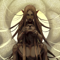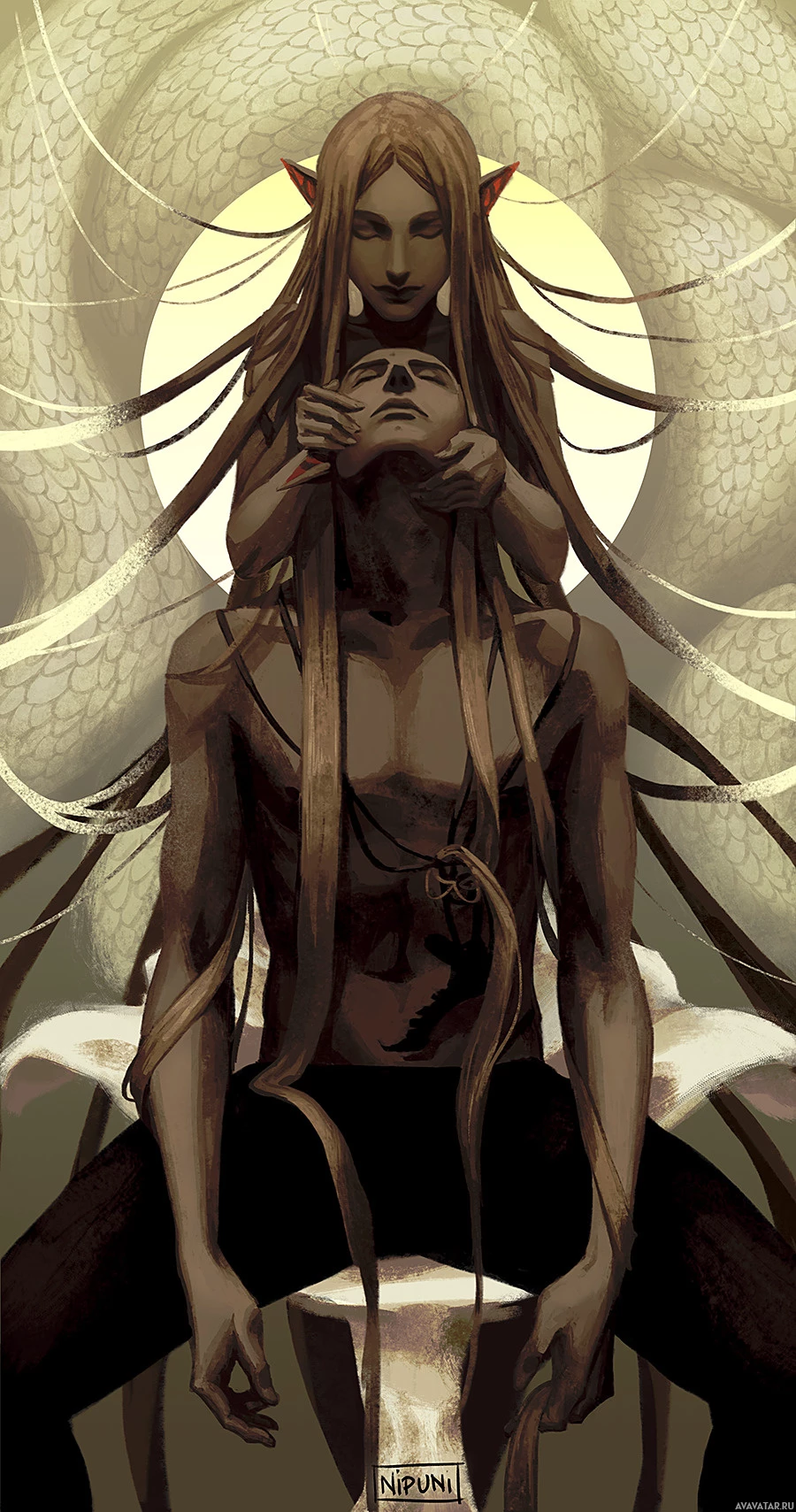 long hair and intricate tattoos or markings on his skin. This character is seated and has
