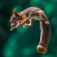 На картинке изображена маленькая белка, парящая в воздухе. Кажется, что она прыгает, и это движение придает ей почти динамичную позу с растопыренными конечностями. На заднем плане изображена естественная обстановка, возможно, парк или лесистая местность.
