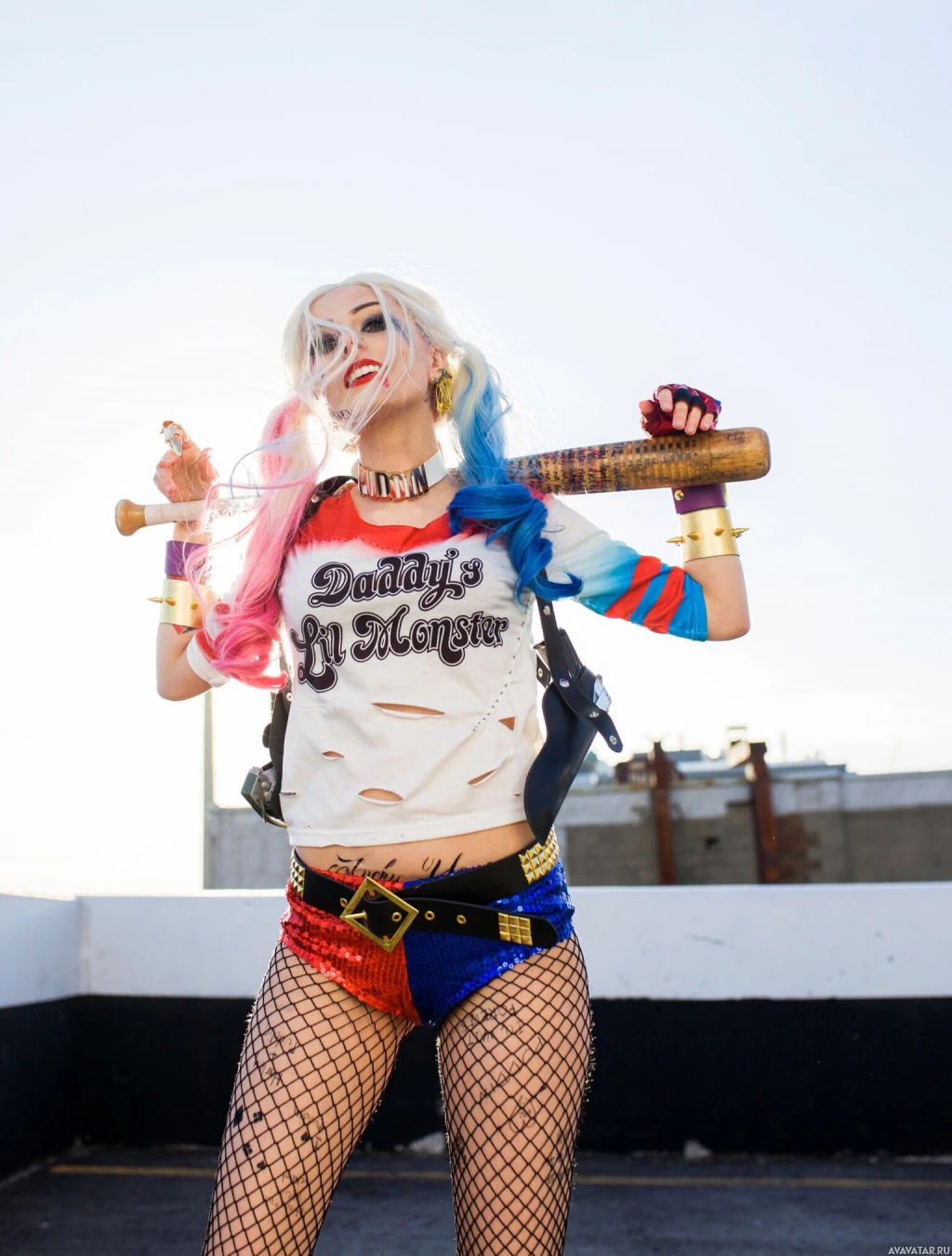 signature pink, blue, and yellow costume, complete with a baseball bat, boots, and holster. The individual is posing for the photo, striking