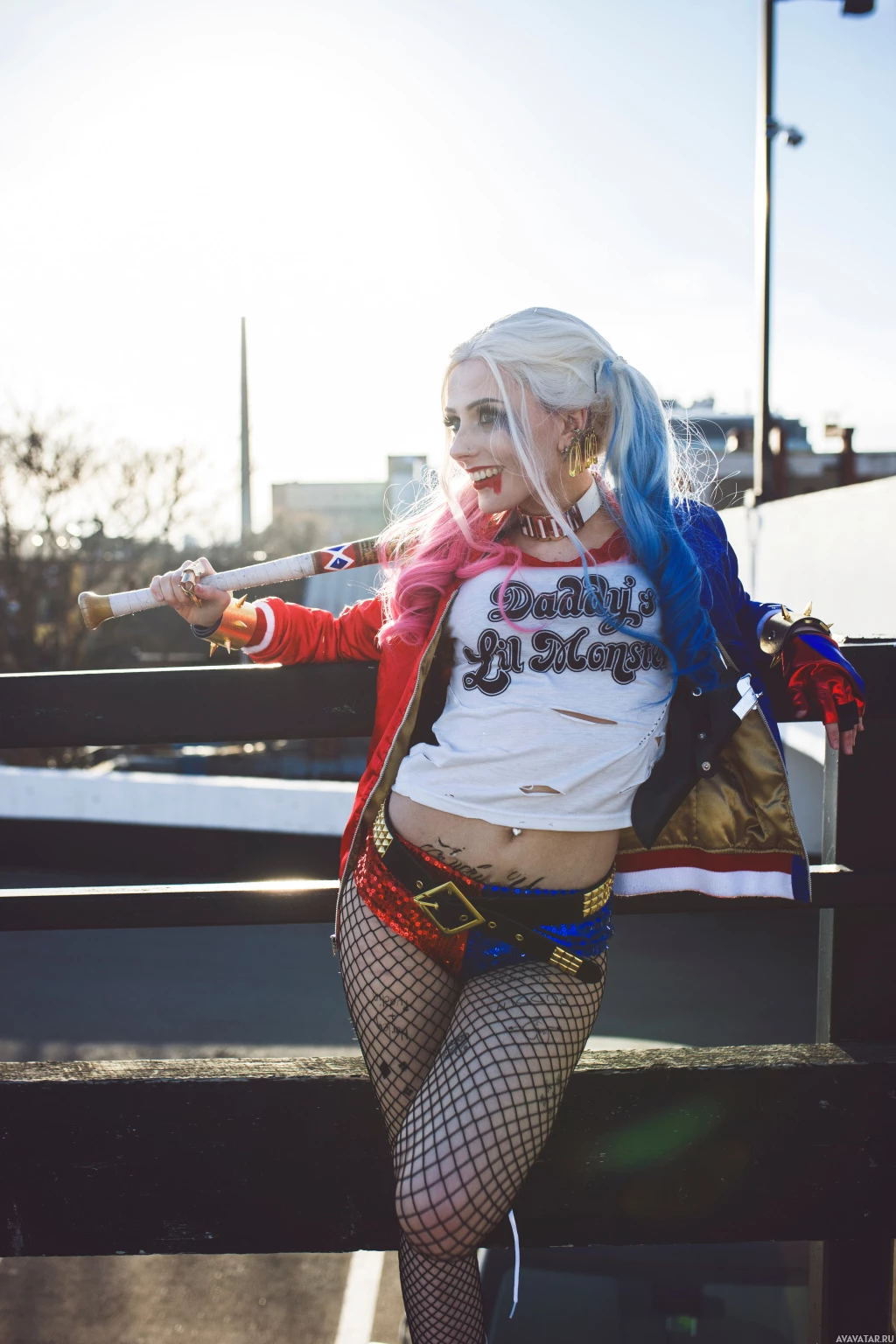 a colorful costume that includes elements inspired by the traditional design of Harley Quinn, such as the jacket and pants with her iconic patterns. They also appear to be wearing fishnet stockings and heels, which is part of Harley's