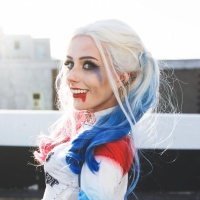 Harley Quinn, a fictional character from the Batman series. They are wearing the distinctive costume with the colorful design and accessories associated with the character, including