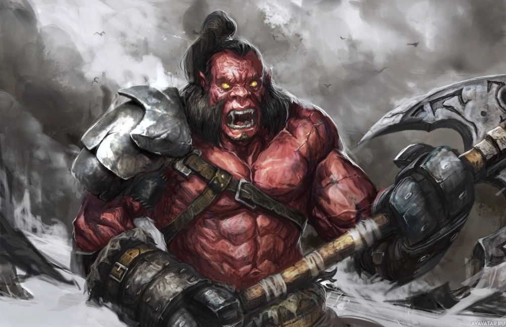 The image shows a character from the game "Dota 2." He is depicted as a muscular, red-skinned individual with