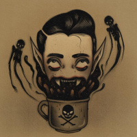 dark liquid, which could symbolize coffee, tea, or a more sinister substance like blood. Surrounding the mug are several