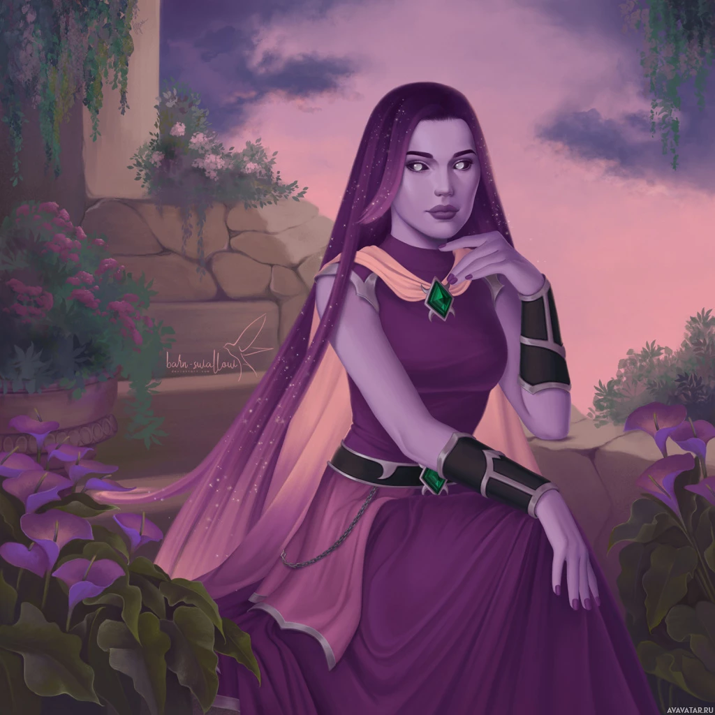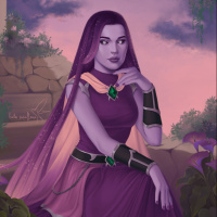 an animated character, a female with purple hair styled in braids. She is wearing a fantasy-themed dress that is primarily purple and white, with