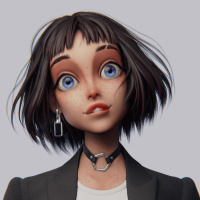 a young woman with short, dark hair. She has a unique, cartoon-like appearance with exaggerated features such as
