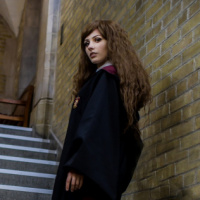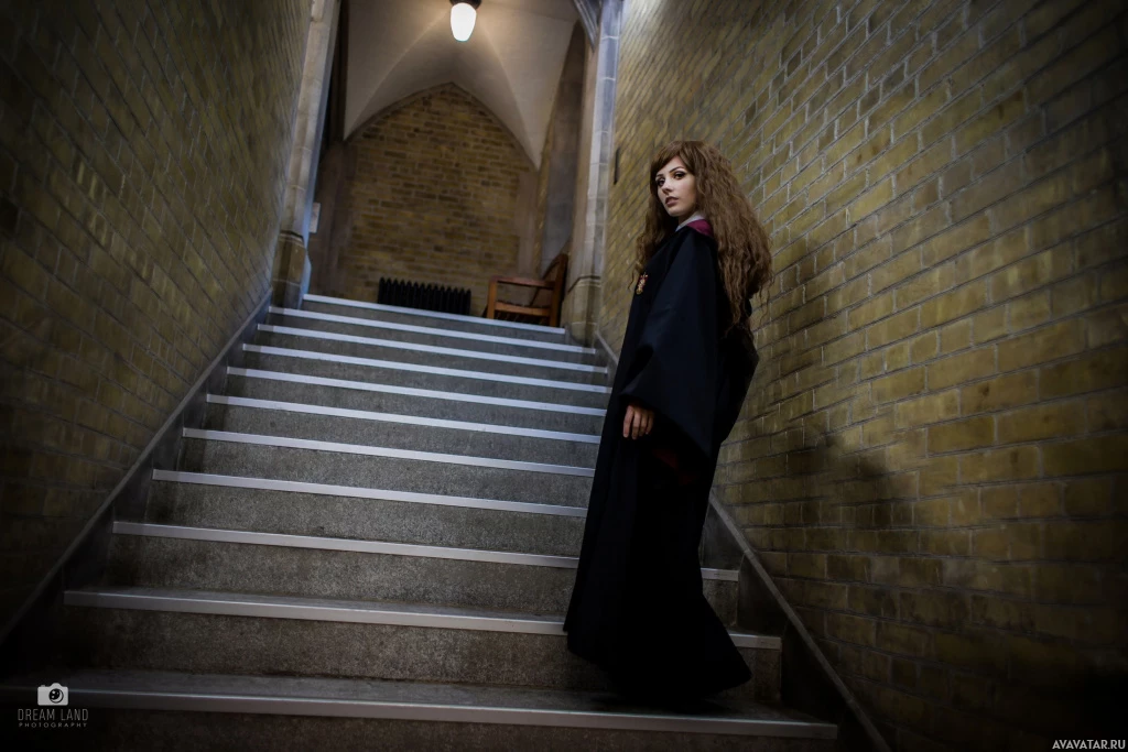 The image depicts a person dressed in cosplay, specifically as the character Hermione Granger from