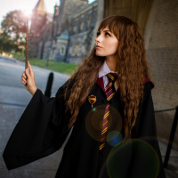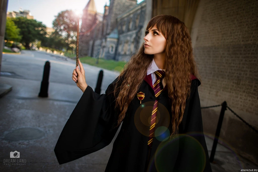 the Harry Potter series. The individual is wearing a Hogwarts robe and holding a wand, which are
