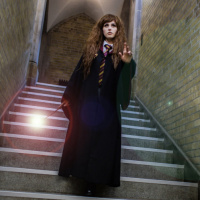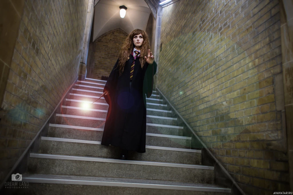 a cosplay outfit that appears to be inspired by the character of Hermione Granger from the Harry Potter series. They are standing on stairs, which could suggest they are inside a place resembling