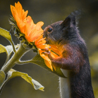 close proximity to flowers, likely from an orange poppy plant (a type of flower). The squirrel appears to be sniffing or touching the flowers, possibly attracted by their scent. The environment looks like