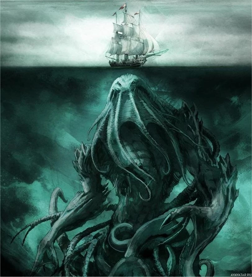 a fantasy scene with an octopus or similar sea creature prominently featured. It appears to be a blend of horror and nautical themes, as the creature is situated in the foreground, and there is a ship with sailing masts in the background under