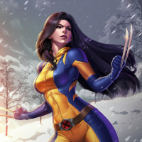 a female character depicted as X-23, who is known for her role in the X-Men comics and movies. She is standing on