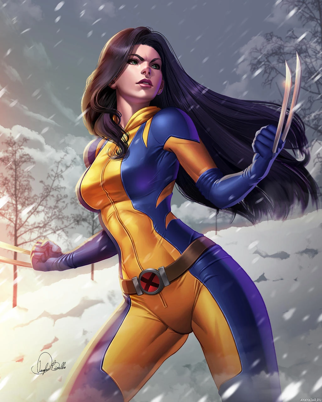 a snowy surface with trees around, dressed in the iconic blue and yellow costume associated with this character. Her pose suggests action or readiness for battle, consistent with her portrayal as a skilled fighter in