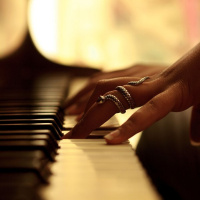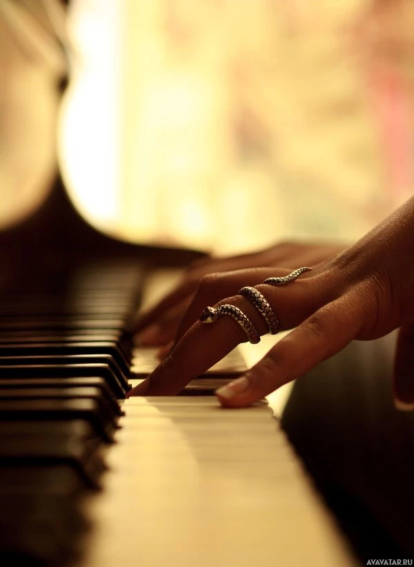 The image shows a close-up view of someone's hands playing the piano. The person is wearing rings on their fingers, indicating personal style or jewelry choice. The focus is on the hands and